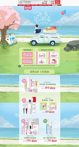 瓷肌 美妆彩妆护肤化妆品 春季出游季 春天 初夏 手绘插画 天猫首页活动专题页面设计