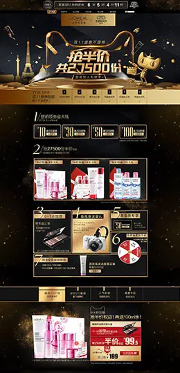 欧莱雅 美妆 彩妆 化妆品 双11预售 双十一来了 黑金 天猫首页活动专题页面设计
