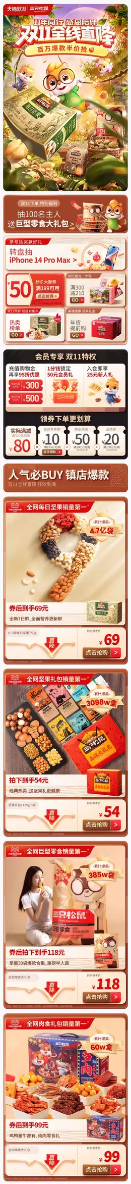 三只松鼠 食品 零食 休闲食品 双11预售 双十一来啦 手机端 M端活动首页设计