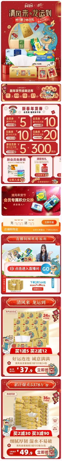清风 家居用品 日用百货 纸巾 纸品 国潮 国风 新年 年货节 大促活动首页设计